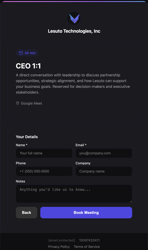 Clients enter their name, email, phone, and company — plus any custom notes or questions you've configured per meeting type. One click to confirm. A branded confirmation email is sent instantly with the Google Meet link, date, time, and your custom message.